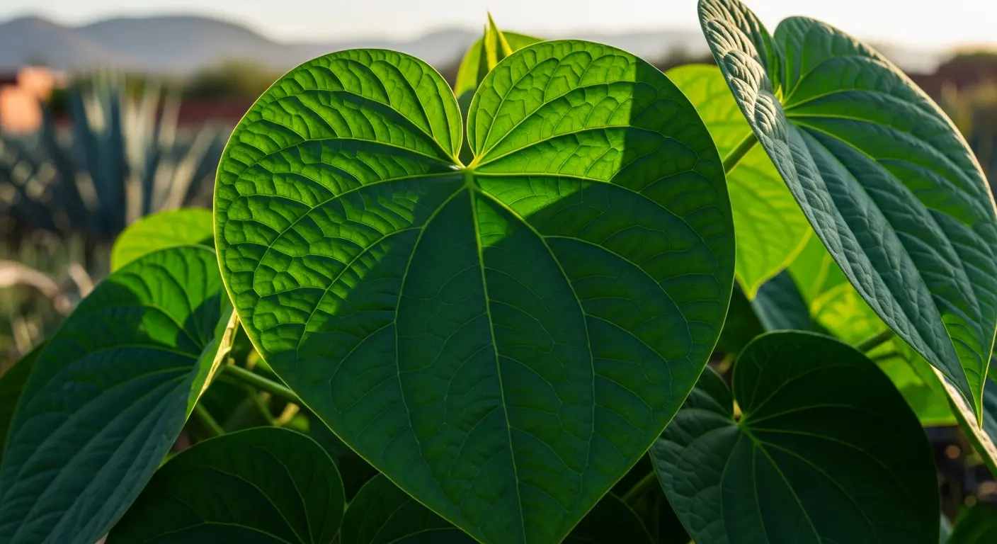 Piper auritum Kunth gehört zur Familie der Piperaceae (Pfeffergewächse, Ordnung Piperales) und ist damit ein echter Verwandter des schwarzen Pfeffers (Piper nigrum). Doch während wir bei fast allen anderen Piper-Arten die Beeren nutzen, sind es beim Acuyo die riesigen, herzförmigen Blätter (bis 30 cm Durchmesser), die kulinarisch und medizinisch verwendet werden. Die Pflanze wächst als krautiger Strauch mit hohlen, knotigen Stängeln und kann Höhen von 2 bis 6 Metern erreichen. Die Blätter sind samtig-weich, dunkelgrün und verströmen bei Berührung sofort ein intensives Anis-Sassafras-Aroma. Der Name „auritum" (lateinisch „geöhrt") bezieht sich auf die ohrförmige Blattbasis.